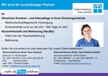 Zur Evangelische Kirche in Essen gehören auch die so genannten Diakoniestationen, die ambulante Pflege, Beratung und Unterstützung von pflegenden Angehörigen bieten. Die Geschäftstelle der Diakoniestationen Essen gGmbH befindet sich auch bei uns in der Julienstraße 39.