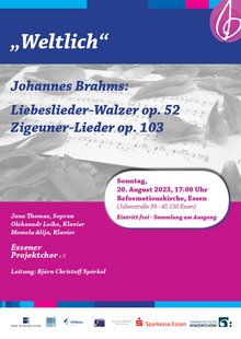 Schwerpunkte unserer bisherigen Aufführungen sind eigentlich kirchenmusikalische Aufführungen. Nach dem großen Zuspruch und Erfolg Anfang 2020 möchten wir dem Wunsch des Publikums entsprechen und mit den "Zigeunerliedern & Liebeslieder-Walzern" von Johannes Brahms ein weltliches Sommerkonzert anbieten. Mit Oleksandr Loiko (unserem Pianisten aus der "Petite Messe solennelle" von G. Rossini), der Pianistin Memela Alija - beide Absolventen der Folkwang Universität - und Jana Thomas, einer Sopranistin aus Lübeck, dem Essener Projektchor und dem Dirigenten Björn Christoff Spörkel werden diese Werke zu Gehör gebracht. Besonders interessant sind vier Hände auf einem Flügel! Die Brahms Kompositionen entstanden 1870 - 1888 - dem Jahrhundert der Chormusik! Sie sind leicht verständlich und für einen kleinen Chor vorgesehen.
