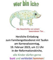 Wir laden ein zum Familiengottesdienst mit Taufen am Karnevalssonntag, den 19. Februar 2023 um 11 Uhr.