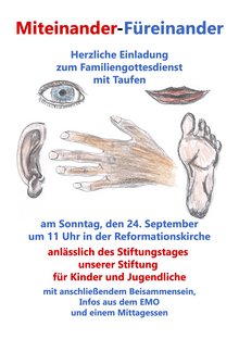 Groß und Klein, jung und alt sind herzlich eingeladen zum Familiengottesdienst am 24. September um 11 Uhr in der Reformationskirche. Mit diesem Gottesdienst und einem Beisammensein im großen Saal wollen wir uns auch bei allen Stifter*innen sowie allen, die an unserer Stiftung interessiert sind, bedanken.