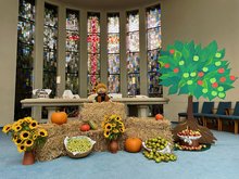 Groß und Klein versammelten sich um den mit Blumen, Früchten, Kürbissen und Strohballen stimmungsvoll dekorierten Altarbereich und feierten gemeinsam das Abendmahl mit Brot und Traubensaft.